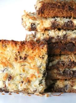 Graham cracker crust with layers of dark chocolate, white chocolate, macadamia nuts, pecans, sweet milk and then topped with toasted coconut. Each bar measures 3" x 3 ".